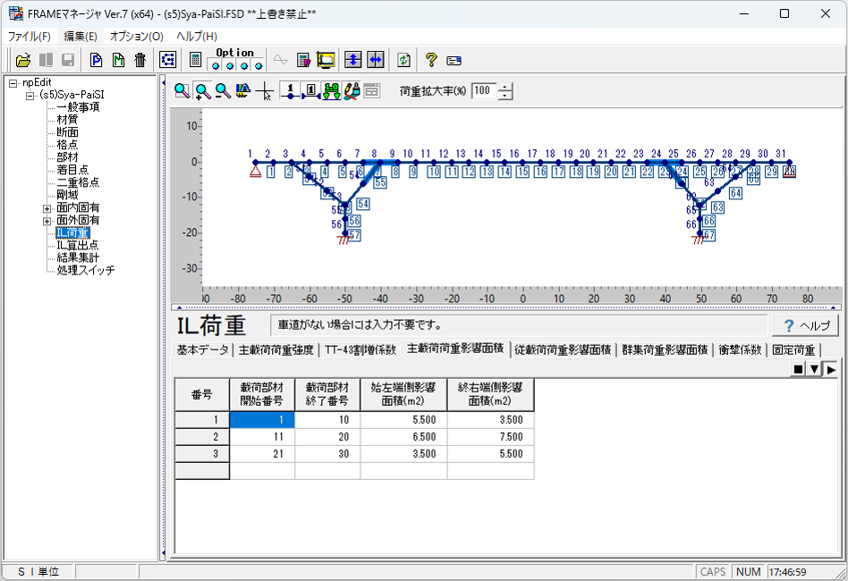 FRAMEマネージャのIL計算では、上部構造を1本の棒部材とみなした橋軸方向の影響線解析が可能です。1本の棒部材に置き換える場合、活荷重の影響面積には一般的に(影響面積)=(載荷幅)×1.0で計算した値を入力します。しかし、上部構造が2主桁で片方の主桁のみ設計するような場合には、設計したい桁に着目した影響面積を算出する工夫が必要となります。 影響面積について 影響面積は活荷重を載荷する位置の横方向(橋軸直角方向)の幅を定義するデータです。車道幅員のうち主載荷幅(5.5m)に相当する部分を「主載荷荷重影響面積」、従載荷幅(5.5m以外)に相当する部分を「従載荷荷重影響面積」、歩道幅員に相当する部分を「群集荷重影響面積」に入力します。 1つの棒部材に置き換えて影響線解析を行う場合 橋軸直角方向の影響を考えず、1本の棒部材に主載荷荷重、従載荷荷重、群集荷重をそのまま作用させる場合、橋軸直角方向の影響線は図2のように考えることができます。この場合は、各荷重が載荷される幅員を影響面積として入力することになります。 2主桁で片方の主桁のみ設計する場合 上部構造が2主桁で片方の主桁のみ設計する場合、橋軸直角方向の影響線を図3のように考えて各影響面積を算出し、本製品に入力します。このとき、設計する主桁にもっとも不利な応力が生じるよう主載荷荷重の載荷位置を決める必要があります。 多主桁で構成される場合 上部構造が多主桁で構成される場合、橋軸直角方向の影響線の形状は橋軸方向の各位置で異なるため、格子解析等を用いる必要があります。弊社別製品「任意形格子桁の計算」のご利用をご検討ください。 |