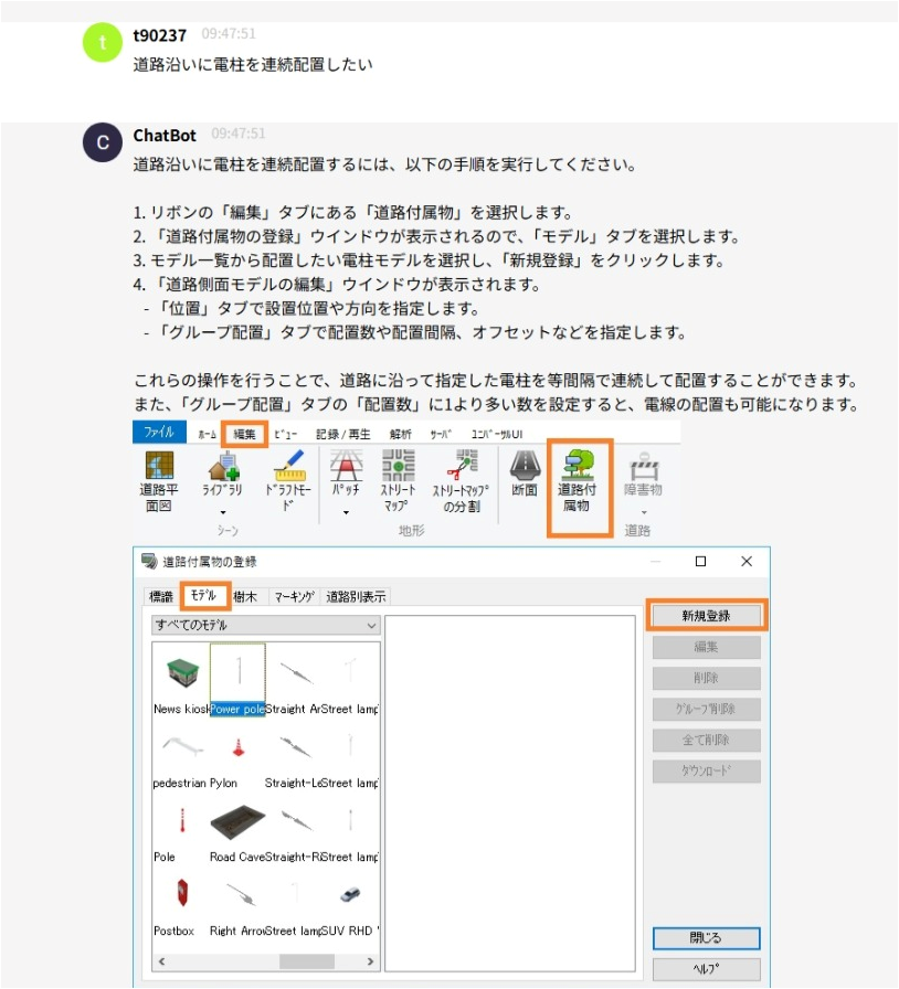 当社製品では、入力操作や設計支援を目的としたAI機能への対応を進めています。UC-win/Roadでは「VRサポートAIサービス」として、操作や入力の疑問にAIが回答。スムーズな操作をサポートし、データ作成などの作業効率を高め、表現や品質の向上に貢献します。