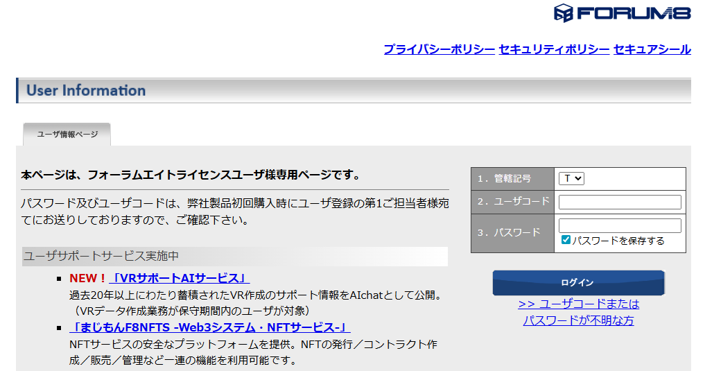 1)FORUM8ホームページ(https://www.forum8.co.jp/)上部の「ログイン」をクリック