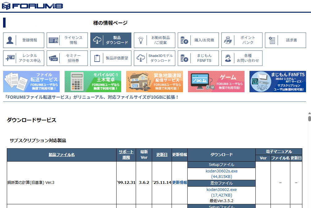 3)ユーザ情報ページメニューの「製品ダウンロード」からセットアップファイルをダウンロード