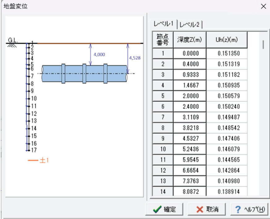 地盤FEM解析を行った結果を直接入力できるように、地盤の水平変位振幅の直接入力に対応します。入力した水平変位振幅を用いて下記位置での変位振幅を計算する。