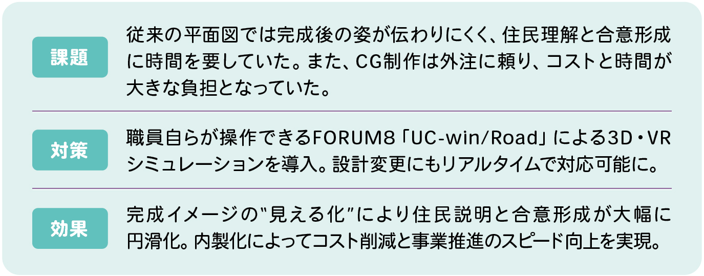見えない未来を“見せる”VRの力 フォーラムエイトの3次元リアルタイム・バーチャルリアリティソフト「UC-win/Road」導入も、その象徴的な取り組みのひとつです。リニア中央新幹線の開業に向けては、大規模なインフラ整備が伴うため、住民説明と合意形成が避けられません。平面図だけではイメージしにくかった道路や構造物の変化も、3Dシミュレーションで「上空から俯瞰」し、「自分たちの目線」で確認できるようになることで、住民の理解度は大きく向上したといいます。 「職員が自分たちで操作して、3Dシミュレーションを作れるようにすることを重視しました」と語るのは、恵那市役所 まちづくり企画部次長 松田泰明氏。外部委託に頼らず庁内でモデリングと修正ができることで、コストも時間も削減できる。住民意見をその場で反映して画面上でルートを動かし、変更後の姿をすぐに見せられる―。そうした“リアルタイムな合意形成”こそが、恵那市がフォーラムエイトのUC-win/Roadを導入した大きな理由でした。 小坂市長は初めてUC-win/Roadで作成したVR映像を見たときに「一体いくらかかったんだろうと思った」と語ります。しかし実際には、外部に発注して作り直していた頃よりも、コスト・時間の観点で総合的な負担は減少しました。くわえて、「ここはもう少しこうしたほうがいいのでは」という住民の声に、シミュレーション上で即座に応えられるようになり、対話性が格段に向上したといいます。「デジタルツインのように、先に仮想空間で検証してから現場に落とす。手間も時間もお金もかかるリアルの前に、何度でもやり直せるのがVRの強みです」と市長は評価しています。 第24回 3D・VRシミュレーションコンテスト